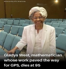 So, readers remember the name Gladys West and the fact that it was her work in the development of the GPS that guides you safely to your destination without having to pull off the highway to retrieve and study a folded old Rand McNally paper map from your glove compartment.